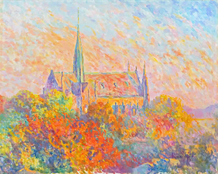 Oil Series: Connecticut Landscapes, St. Mary's Church at Sunset, Stamford, CT Media: oil, palette knife technique 20” x 16”