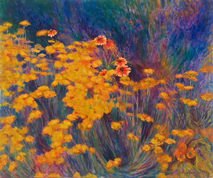 Oil Series: Texas Impressions, Texas Wildflowers, Coronation Gold, "Indian Blanket" (Texas Prairies) , 36” x 30” Media: oil, brush and palette knife technique